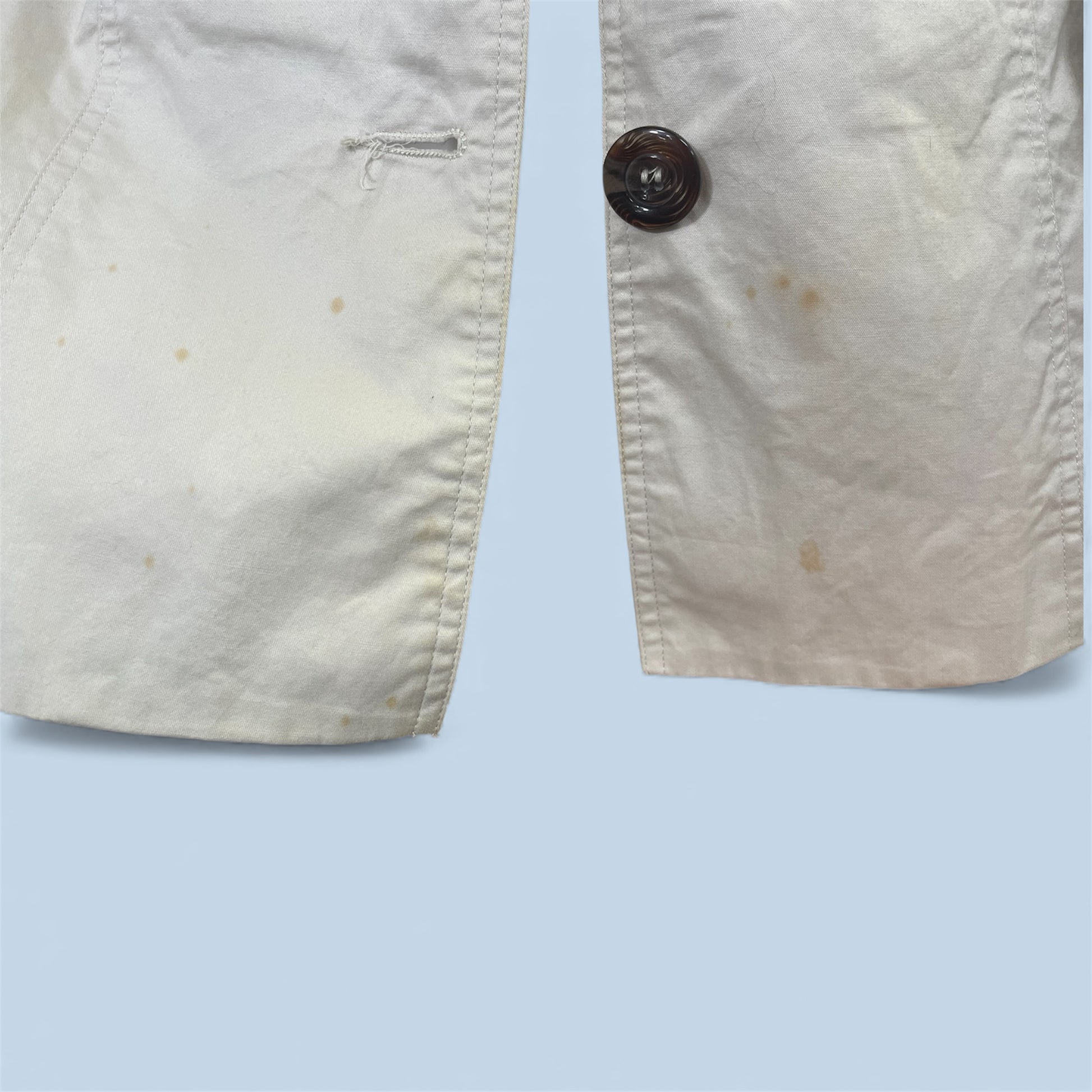 A classic Valleysgirl trench-style coat in a light cream colour with a flattering fitted shape and waist belt. A timeless style that could suit someone happy to spot-clean or upcycle.